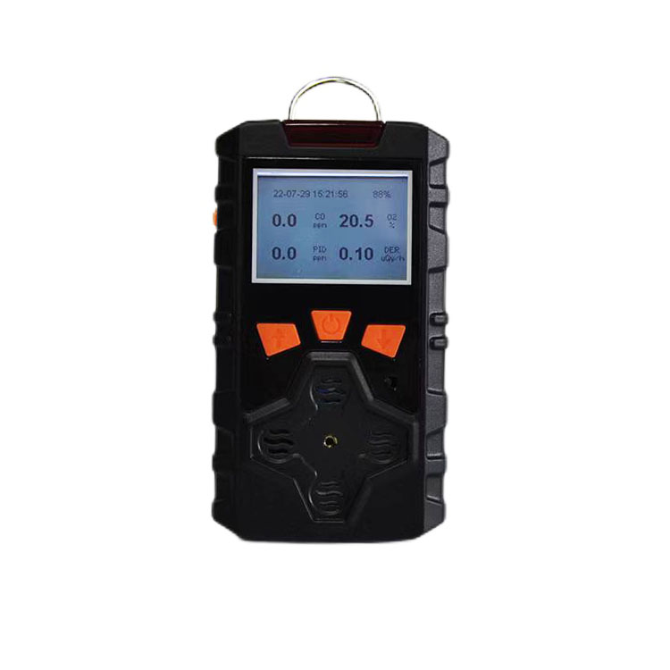 Backlit screen shows gas name, concentration, radiation level, and time stamp.